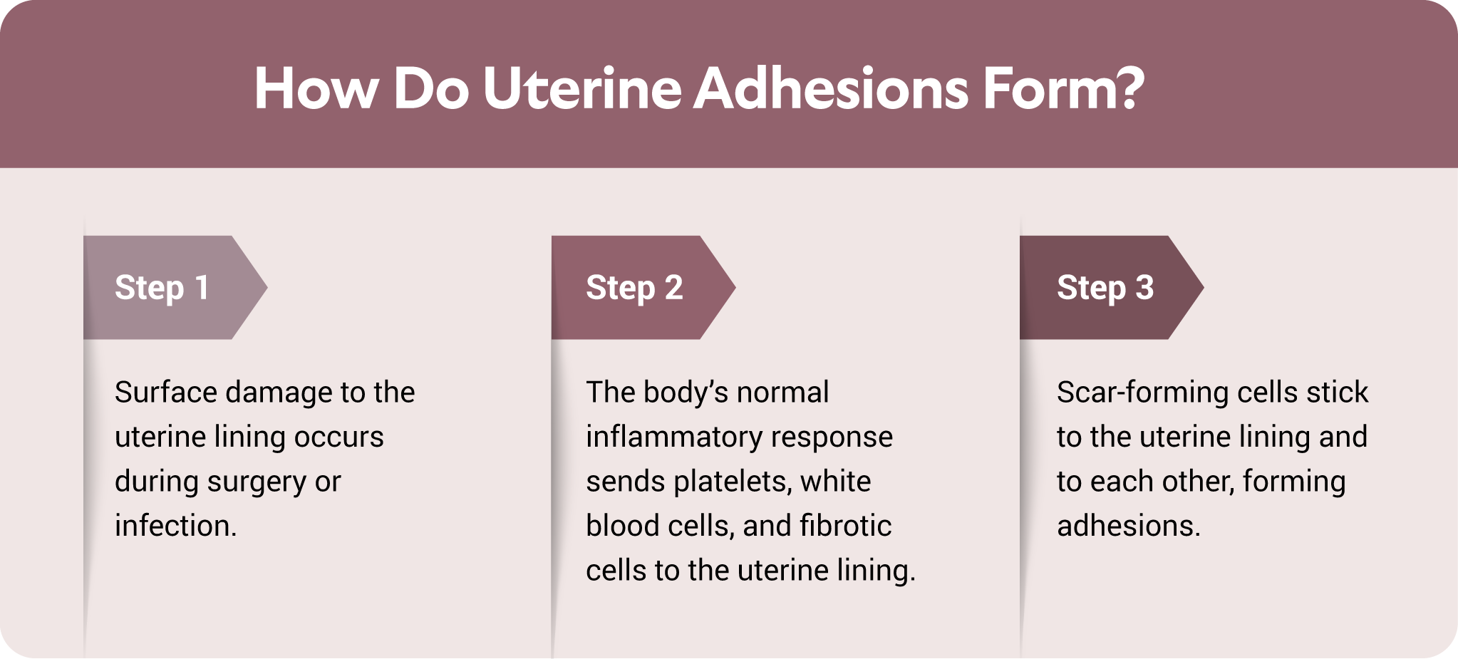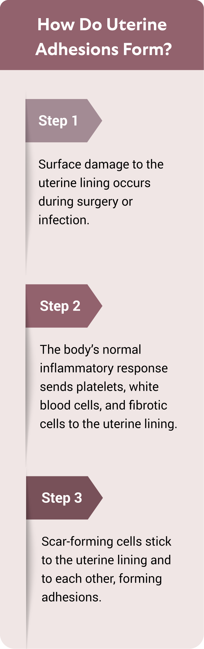 | 3. Adhesions block or distort the uterine cavity | Blood can't flow normally, and embryo implantation is disrupted. | Infertility, miscarriages, or failed IVF cycles |